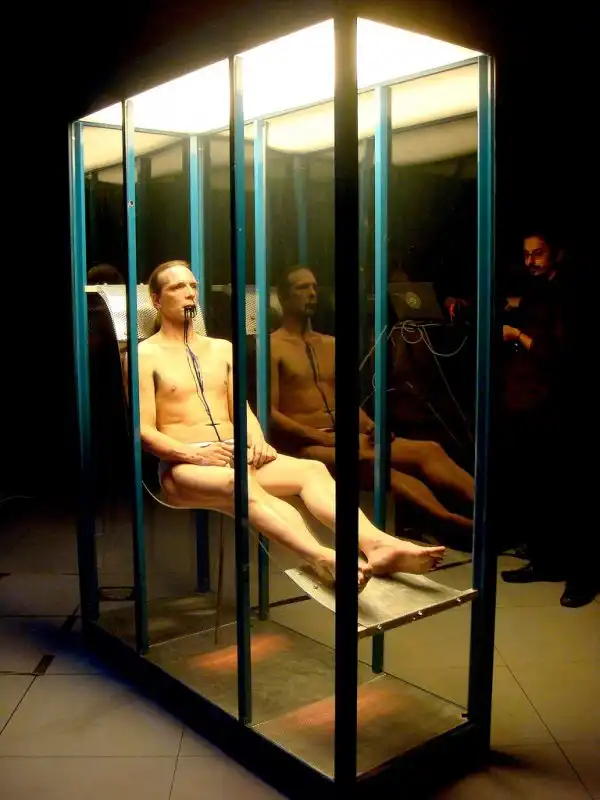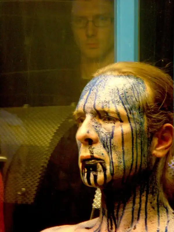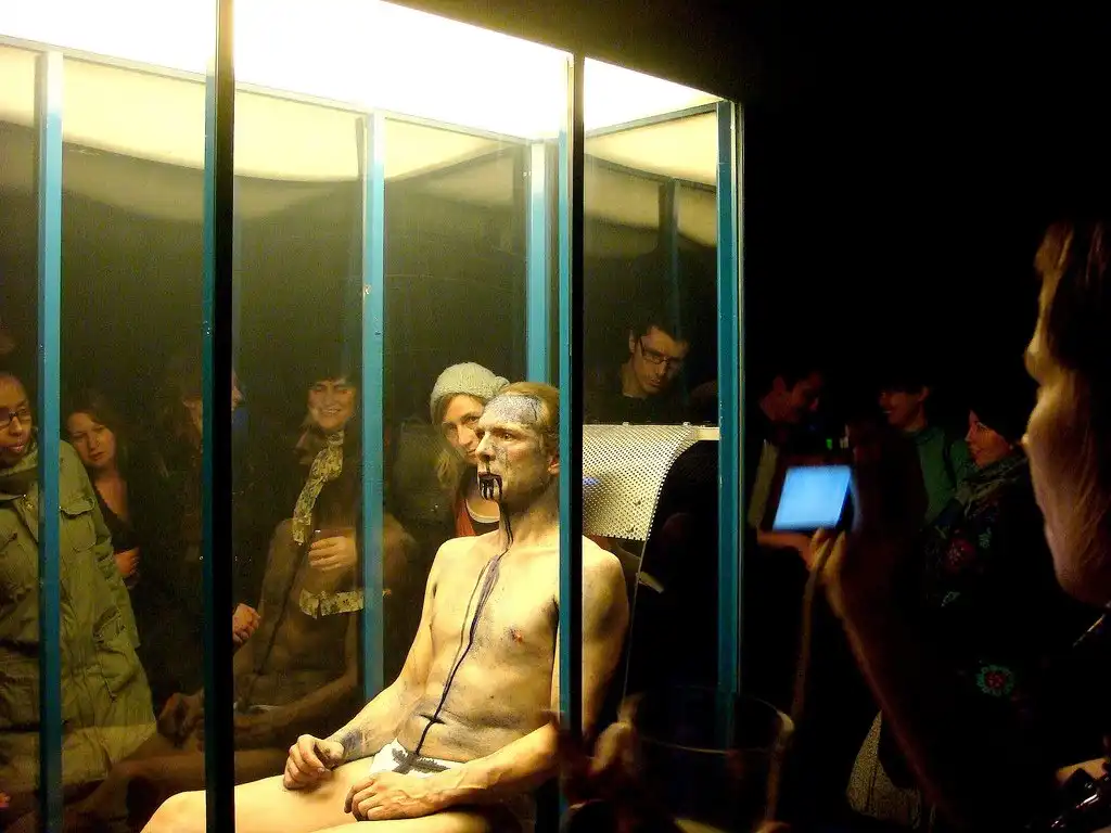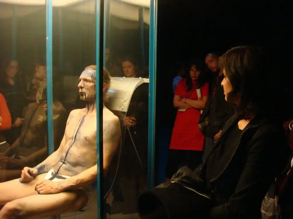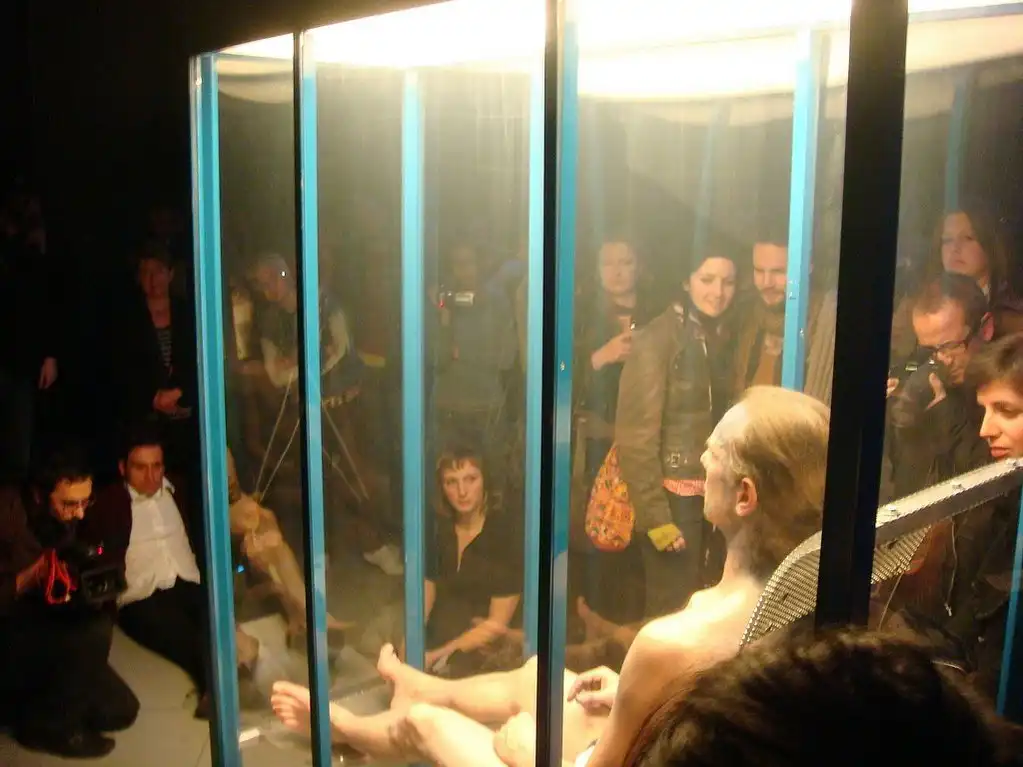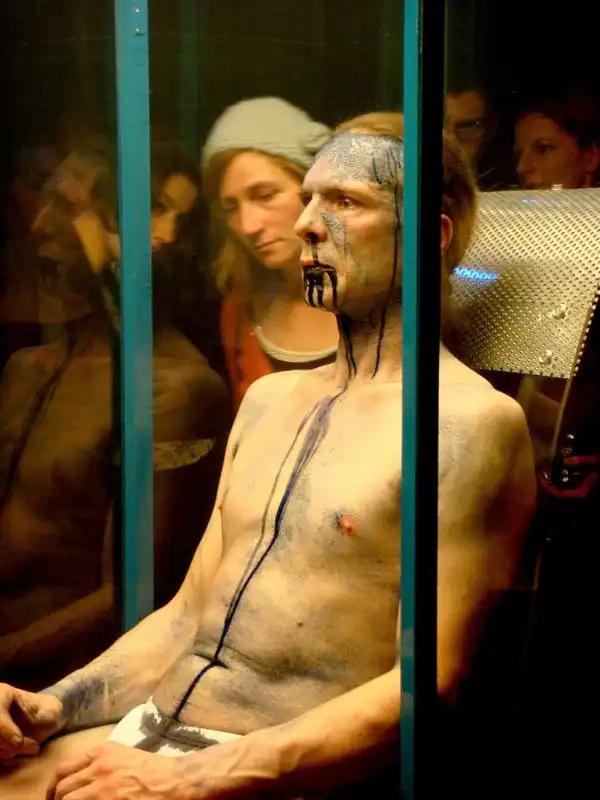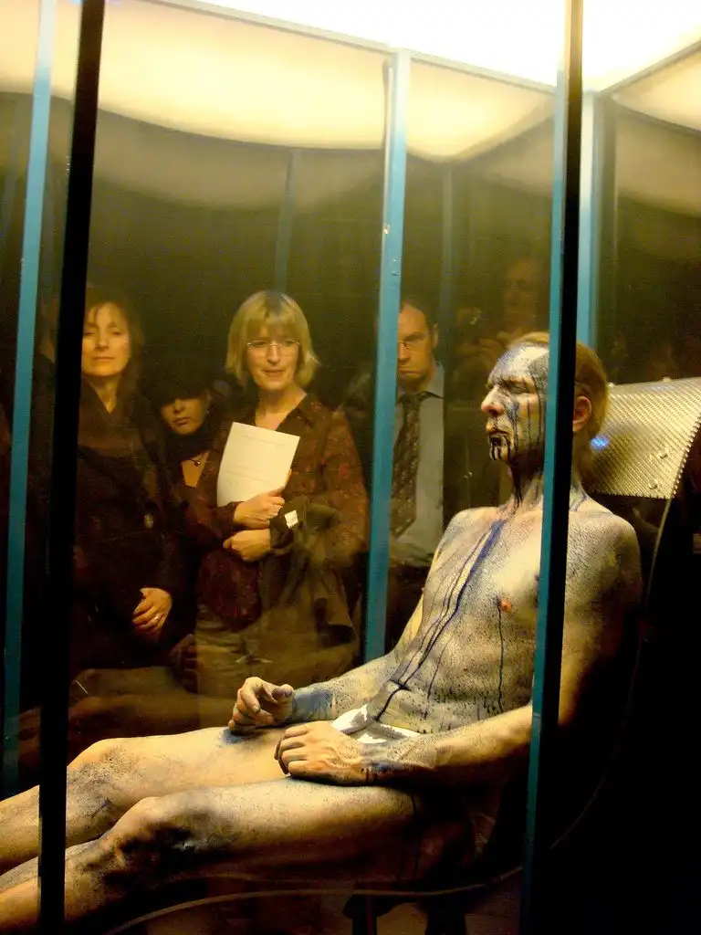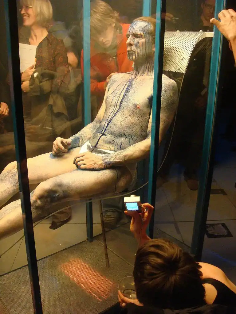 Художник в течение часа сидел в прозрачной камере и зрители наблюдали синие слезы, синие слюни и синие капельки пота на теле художника.