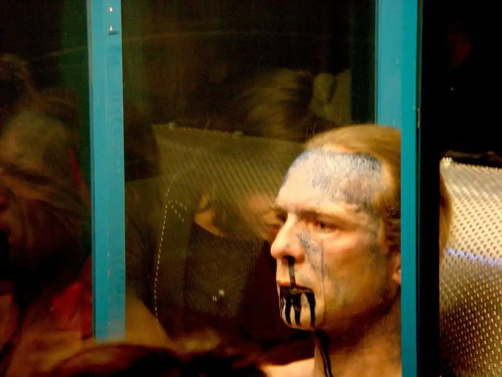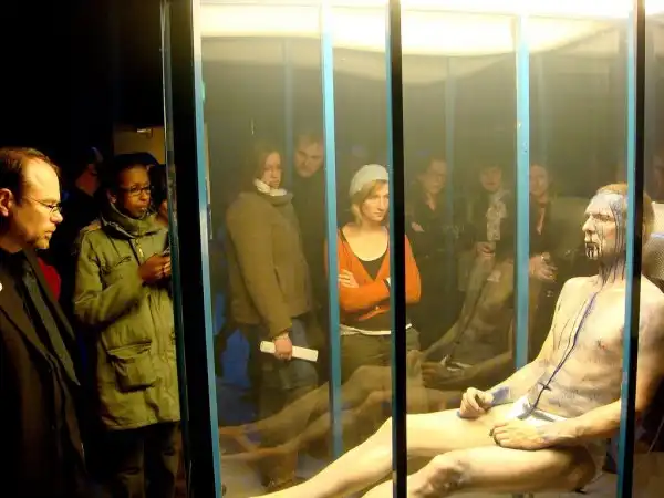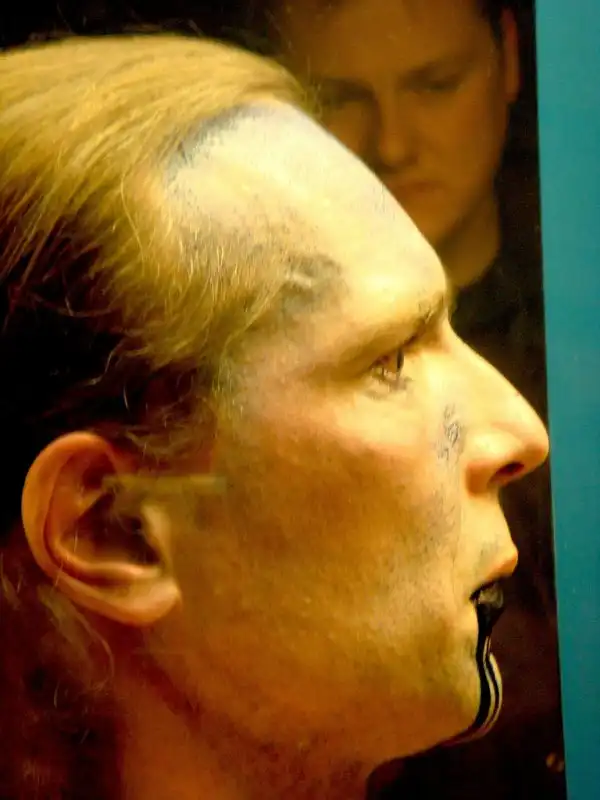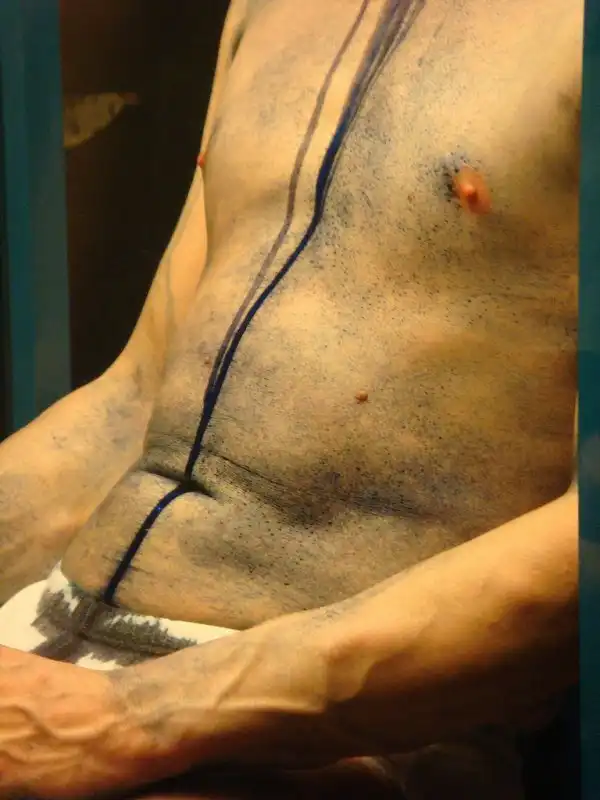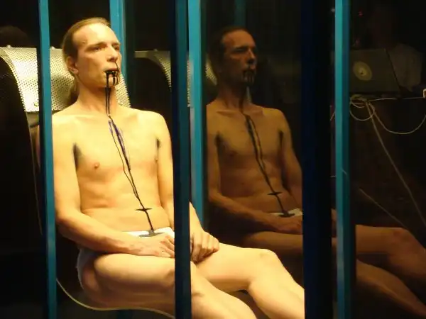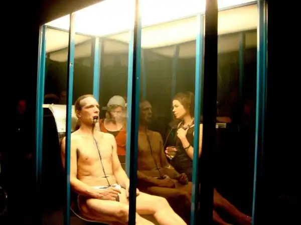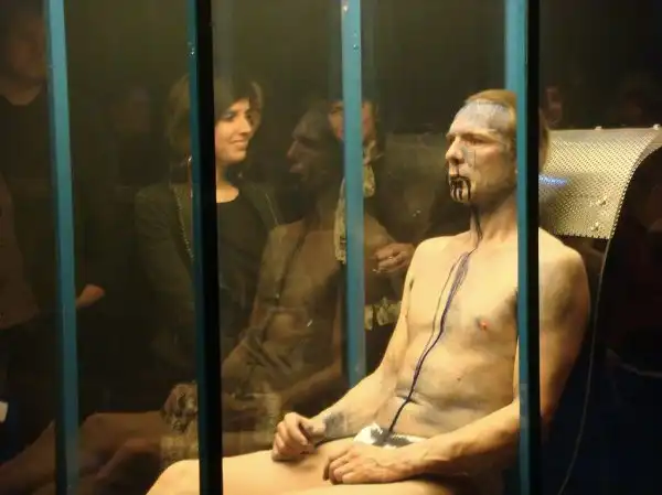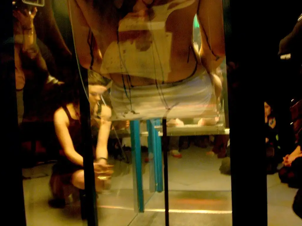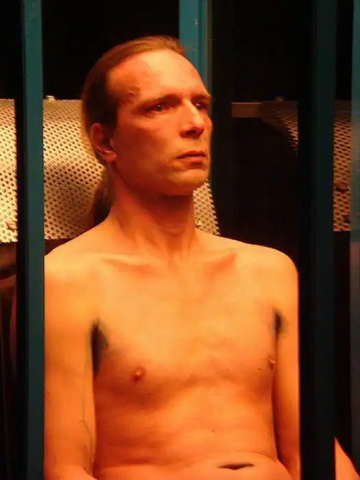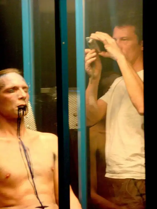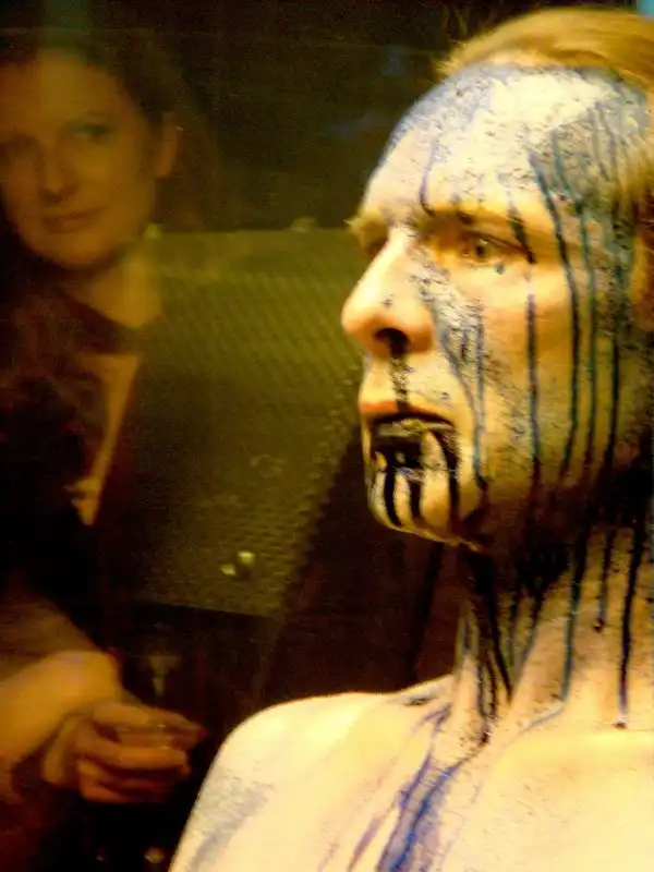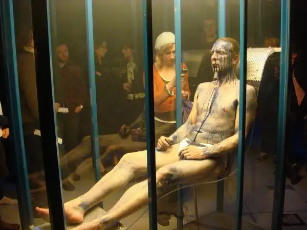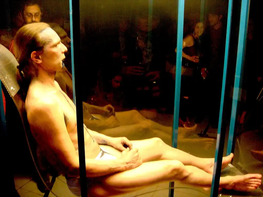 Художник в течение часа сидел в прозрачной камере и зрители наблюдали синие слезы, синие слюни и синие капельки пота на теле художника.
