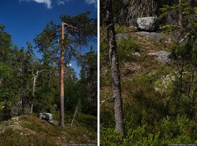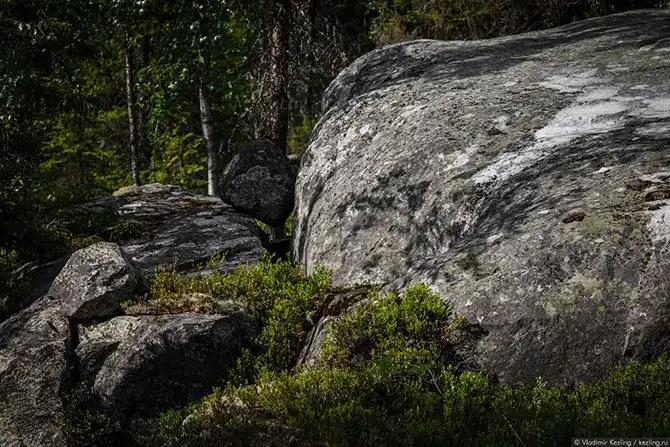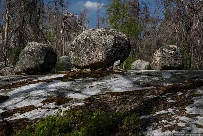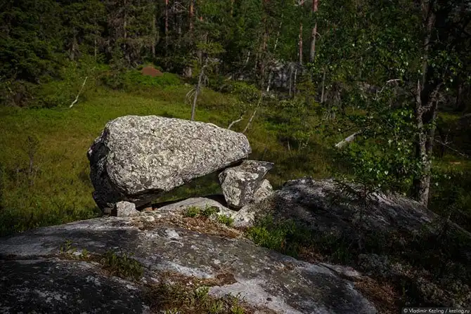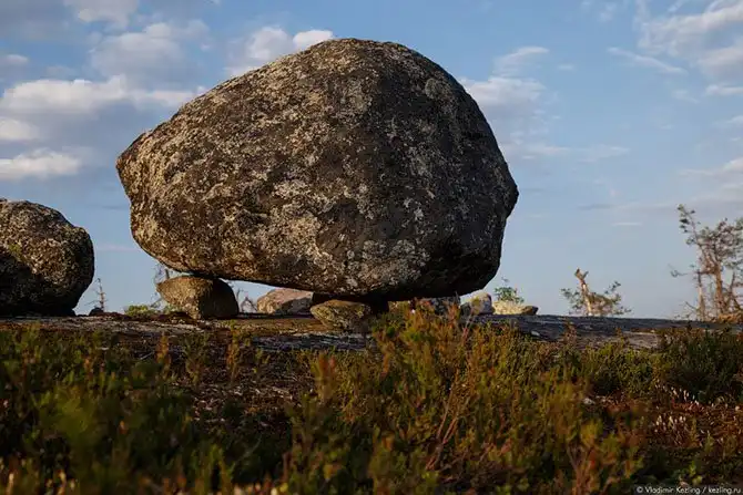 Раскрою-ка я вам один страшный секрет: валуны на ножках — вовсе не какое-то местное уникальное явление. Подобные каменные группы встречаются по всей территории Северной Европы, просто на вершине Воттоваары, благодаря скальному основанию и отсутствию на нём почвенного слоя, этот эффект наиболее заметен, в то время как в других местах нижняя часть скрыта от глаз почвой и растительностью, не позволяя разглядеть полную аналогию в расположении валунов на камнях-ножках.