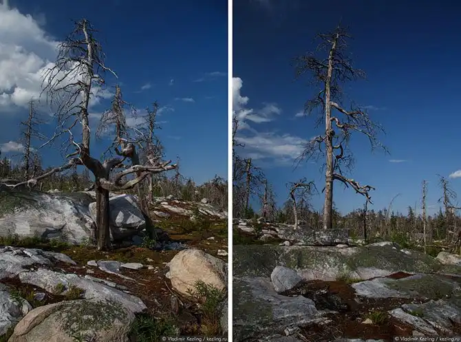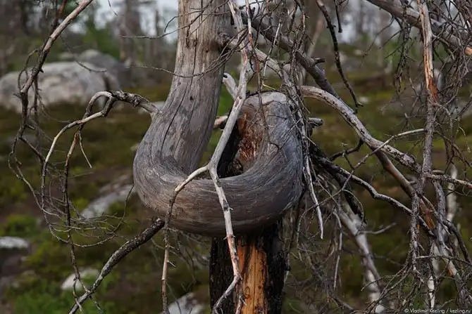 Такое увидишь нечасто. Некоторые деревья выглядят так, будто кто-то со всей силы ударил по ним огромным молотом, отчего их стволы свернулись в невообразимые спирали. При том что другие растут относительно нормально.