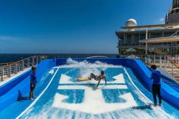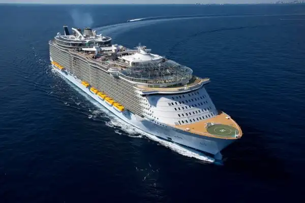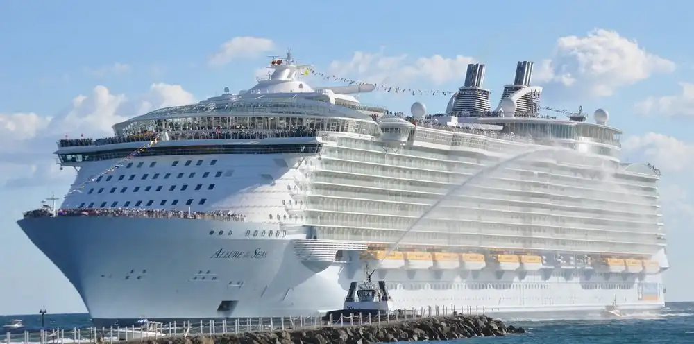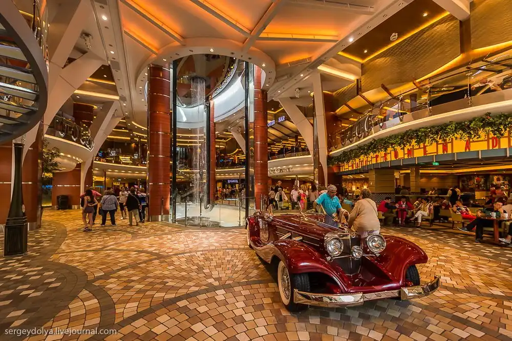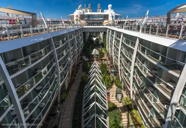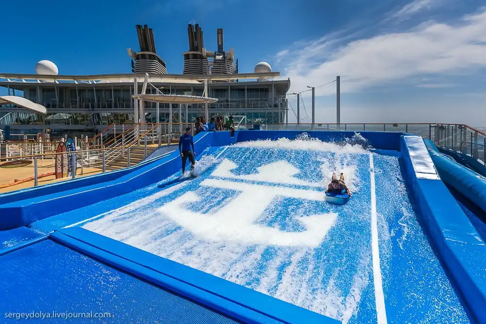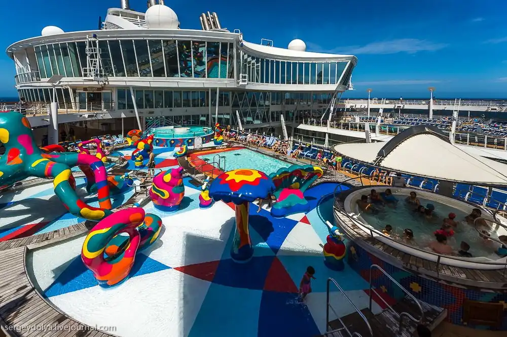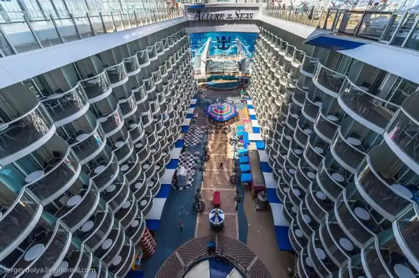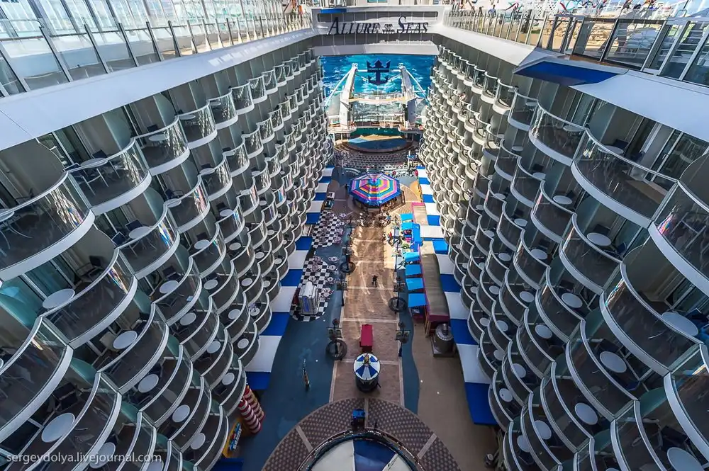 Представьте себе квартал Лас-Вегаса, который плывет из города в город. Представьте корабль на 7500 человек, из которых 2500 - сотрудники и персонал. Добавьте к ним ледовый каток, волейбольные и баскетбольные площадки, поле для гольфа, зал для боулинга, стены для скалолазания, фитнесс центр, спа-салон, бесконечные бассейны и вы получите самый большой круизный лайнер в мире - Allure of the Seas.
