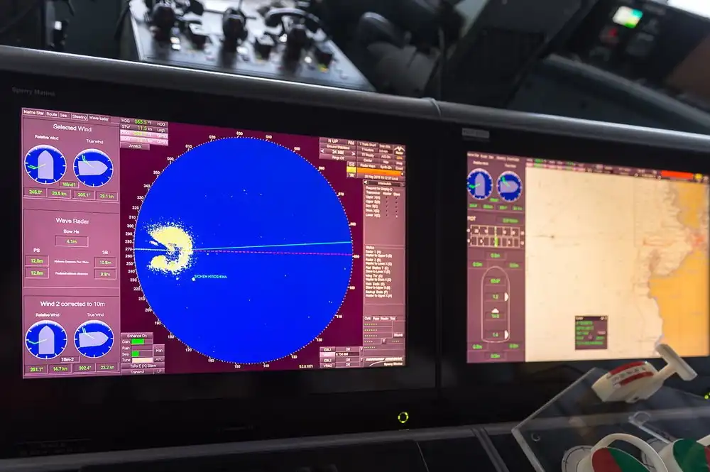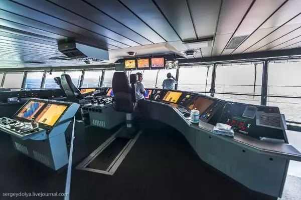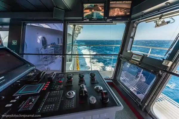 Кораблем управляет не капитан, а первый офицер. Он нам и проводил экскурсию. Офицера зовут Геннадий. Он из Одессы. У корабля нет штурвала. Три винта двигателя вращаются на 360 градусов, их выставляют либо вручную с помощью трех вращалок (на переднем плане фотографии), либо с помощью компьютера. Система следит за курсом и подруливает: