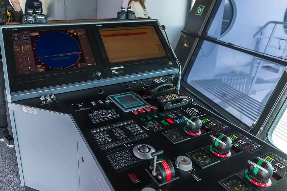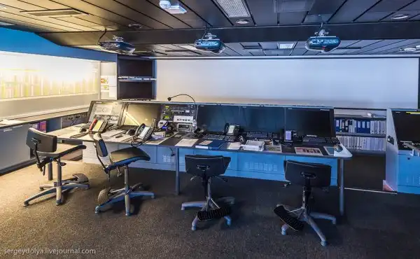 Командный штаб расположен рядом и может отгораживаться от капитанской рубки перегородкой. Тут продублированы все органы управления лайнером: