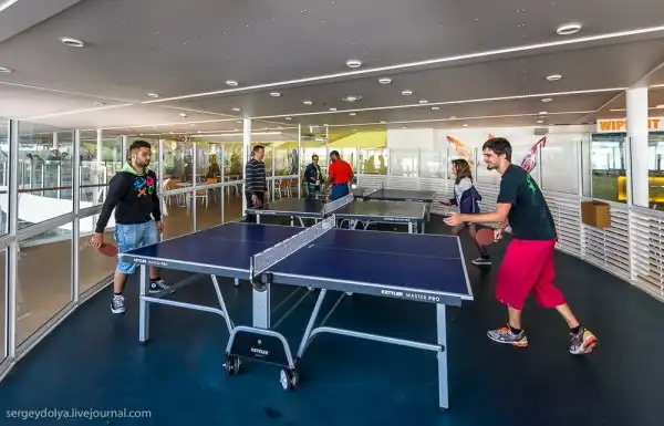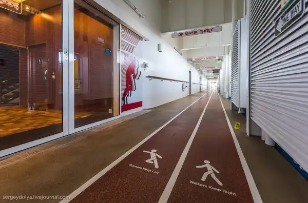 Палуба на уровне пятого этажа выходит к спасательным шлюпкам. Она идет по всему лайнеру, и сюда выводят людей при внештатных ситуациях. Чтобы место не пропадало зря, его используют как беговую дорожку. Так часто поступают пассажиры больших кораблей, но только здесь специально разметили дорожки для бега и спортивной ходьбы. Согласовано даже направление, чтобы не сталкиваться друг с другом. Полный круг 700 метров: