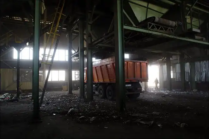 Вот тут сверху мусор трясётся в грохоте и проходит через специально решето (это если сильно упрощать — на самом деле процесс куда сложнее), чтобы затем попасть в виде «земли» в Камаз снизу. В Европе органика активно используется, в частности, отправляется в Африку для того, чтобы останавливать натиск пустыни. У нас, к сожалению, пока так не получится: очень много стекла и, что хуже, — батареек.