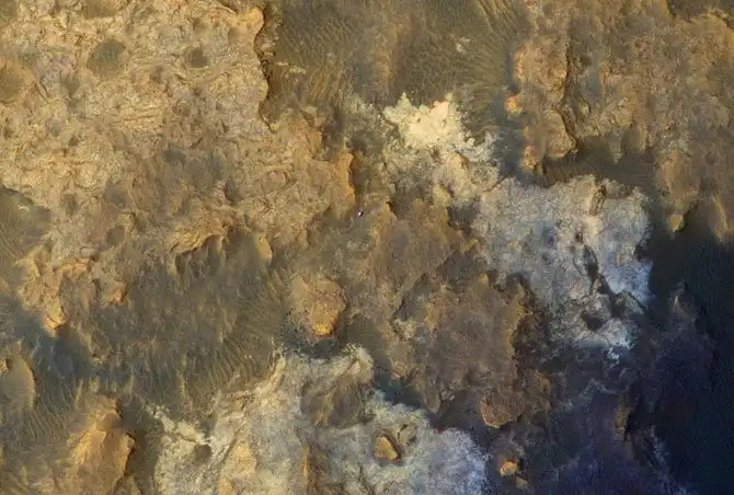 Панорама Марса, виден марсоход. Снимок сделан с камеры HiRISE), установленной на борту космического аппарата Mars Reconnaissance Orbiter, который находится на орбите Красной планеты. Этот телескоп является самым большим телескопом, отправленным в глубокий космос. Марс — четвёртая по удалённости от Солнца и седьмая по размерам планета Солнечной системы; масса планеты составляет 10,7 % массы Земли. (Фото JPL-Caltech / Univ. of Arizona / NASA):