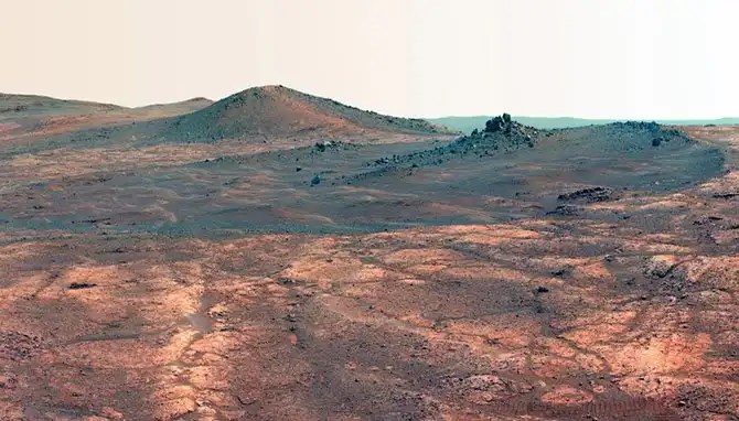 Иногда Марс называют «красной планетой» из-за красноватого оттенка поверхности, придаваемого ей оксидом железа. Температура на планете колеблется от −153 °C на полюсе зимой и до более +20 °C на экваторе в полдень. Средняя температура составляет −50 °C. (Фото JPL-Caltech / Cornell Univ. / Arizona State Univ. / NASA):