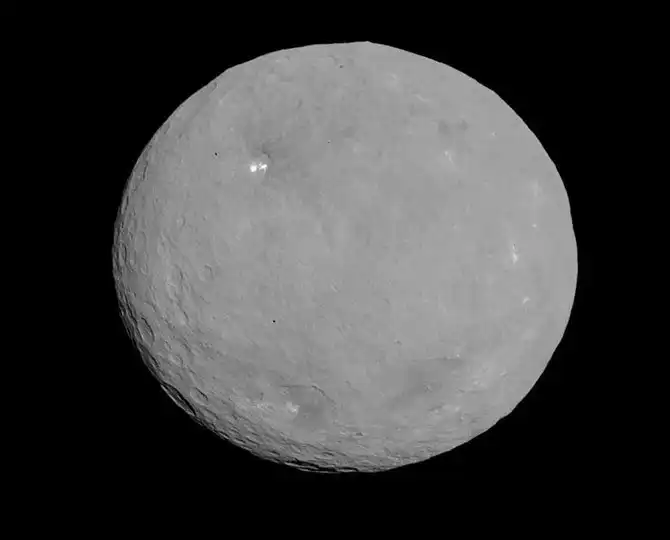 Карликовая планета Церера в поясе астероидов внутри Солнечной системы. При диаметре около 950 км, Церера является крупнейшим и наиболее массивным телом в поясе астероидов, по размерам превосходит многие крупные спутники планет-гигантов. (Фото JPL-Caltech / UCLA / MPS / DLR / IDA / NASA):
