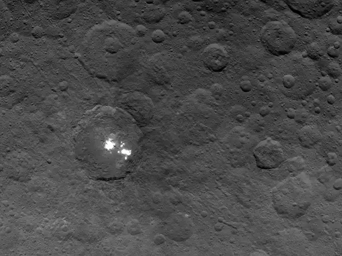 Масса Цереры составляет почти треть всей массы пояса астероидов, но в то же время более чем в 6 000 раз уступает массе Земли и составляет около 1,3 % от массы Луны. На поверхности Цереры различимы несколько светлых и тёмных структур, предположительно кратеров. (Фото JPL-Caltech / UCLA / MPS / DLR / IDA / NASA):
