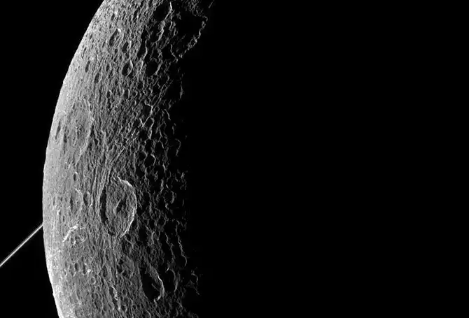 Естественный спутник Сатурна Диона. В мае 2013 года на основе данных «Кассини» специалисты из лаборатории реактивного движения НАСА выдвинули предположение, что под поверхностью Дионы может быть или когда-то был океан. Возможно, когда-то Диона была развёрнута в результате удара крупного небесного тела. Судя по обилию крупных кратеров на Дионе, такой разворот мог происходить неоднократно. Однако её нынешняя ориентация существует в течение миллиардов лет, о чём говорит высокая кратерированность и светлый цвет ведущего полушария. (Фото JPL-Caltech / Space Science Institute / NASA):