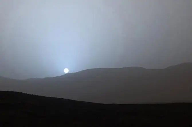 Закат на Марсе. Голубоватый свет — пыль в атмосфере планеты. Во время восхода и захода Солнца марсианское небо в зените имеет красновато-розовый цвет, а в непосредственной близости к диску Солнца — от голубого до фиолетового, что совершенно противоположно картине земных зорь. (Фото JPL-Caltech / MSSS / Texas A&M Univ. / NASA):