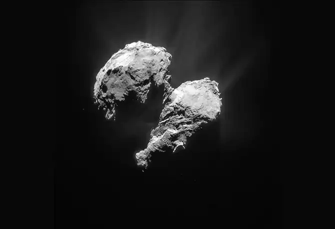 Комета Чурюмова — Герасименко, снятая с космического аппарата «Розетта» с расстояния 77,8 км. Согласно последним оценкам, масса кометы составляет 10 миллиардов тонн. (Фото Rosetta / Navcam):