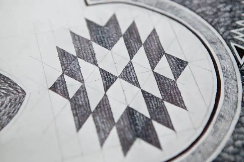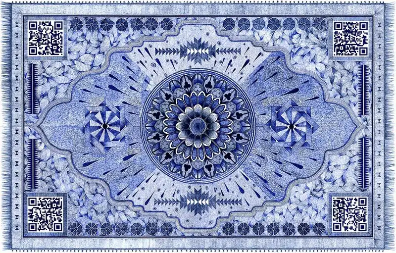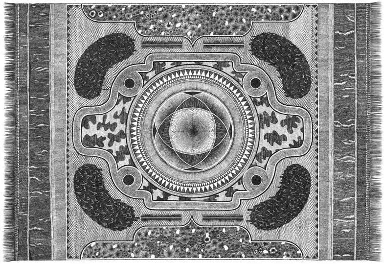 Примечательно, что такой формат выбран не случайно: мусульмане используют аналогичные по размеру коврики во время молитвы. Собственно, авторский проект — это визуализация различных религий с мусульманским уклоном, хотя на первый взгляд он ассоциируется с индуистскими либо буддистскими духовными практиками в контексте модели Вселенной. Прежде чем реализовать задуманное, Джонатан изучил мотивы арабской культуры (живопись и архитектуру), французской готики, краснокожих индейцев и поп-арта.