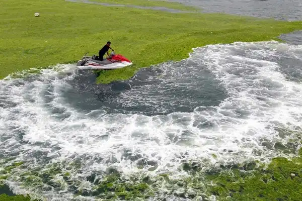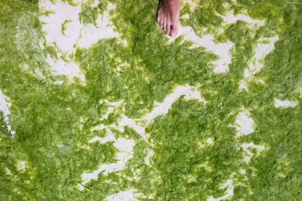 Причина кроется в «цветении» зелёной водоросли Enteromorpha prolifera. В 2013 году, например, ей удалось покрыть 28900 квадратных километров побережья. Сама по себе энтероморфа безопасна для людей, так как не выделяет в воду токсины, что часто происходит при цветении других видов водорослей. С другой стороны, плотный ковер не пропускает свет и поглощает большую часть кислорода из воды, приводя к массовой гибели морских обитателей.