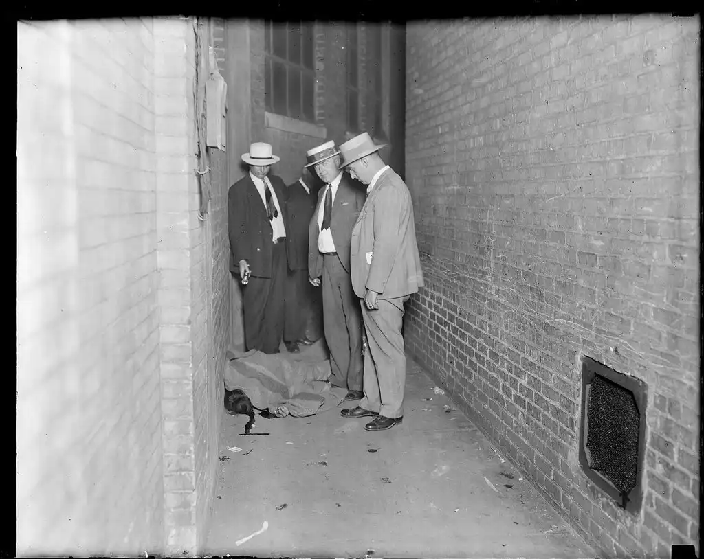 Тело Джона Диллинджера, застреленного агентами ФБР перед входом в кинотеатр Biograph Theater в Чикаго.