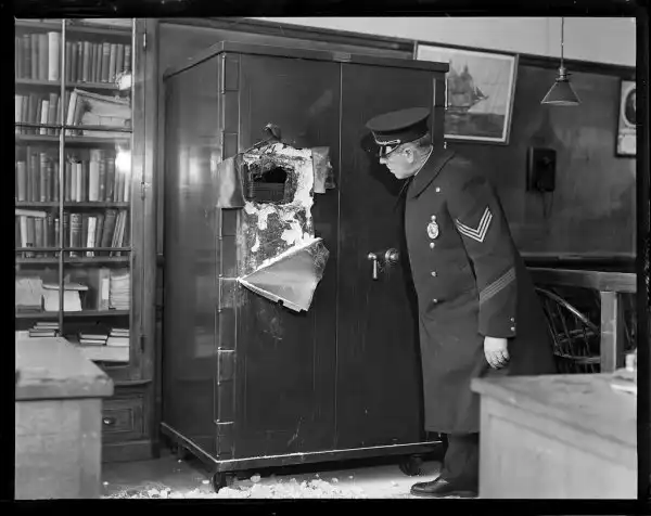 Сержант Салливан исследует сейф, который попытались взломать трое молодых преступников.