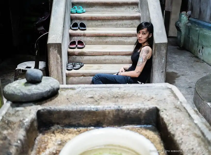 Девчонка Юнк, на лестнице своего дома (Индонезия, Суматра)
