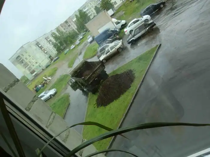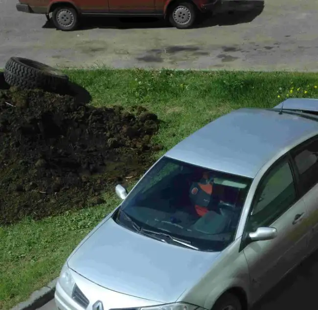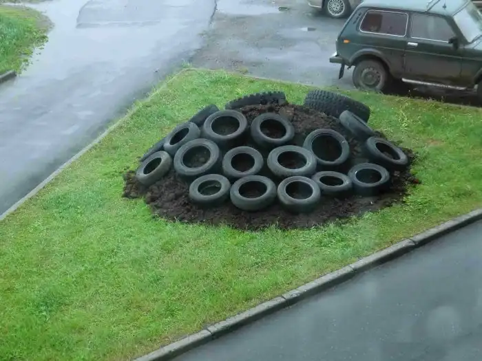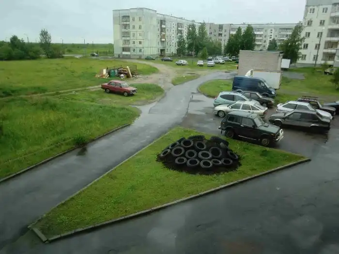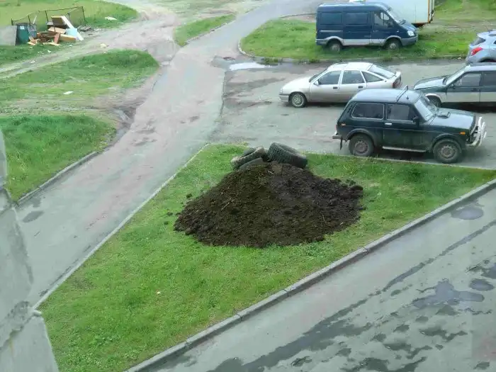 Из-за любителей парковать свои машины на газоне, во дворе этого дома пришлось обустроить вот такую вот клумбу, которая всем своим видом оставляет желать лучшего.