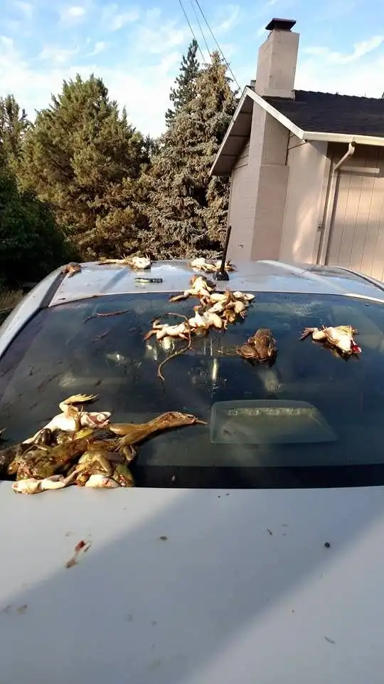 Один незнакомец пригласил девушку на свидание, но та отказала. Судя по всему, чувак оказался чернокнижником, потому как на следующий день она обнаружила около четырех десятков убитых и растерзанных лягушек на своем автомобиле и вокруг него.