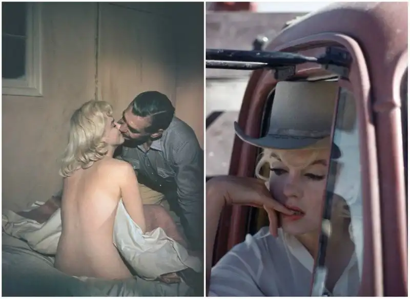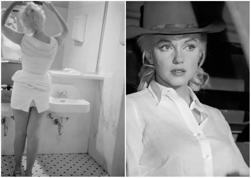 Слева актриса в ванной аэропорта Чикаго; справа на съемках фильма “Неприкаянные”.
