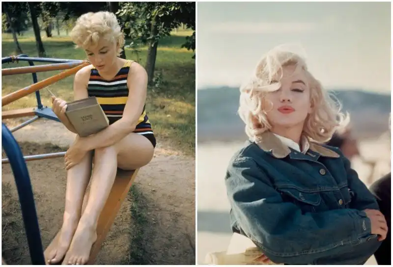 Меэрилин читает произведение Джеймса Джойса “Улисс” (слева). Справа на съемках фильма “Неприкаянные”.