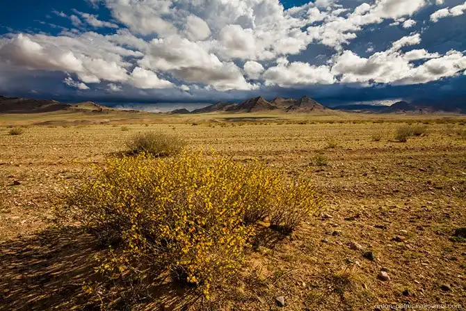 Дальше наш путь пролегал по пустынной местности, где единственной растительностью были вот эти кусты пустынной акации. Как раз попали на цветение. Красивое зрелище, когда до горизонта виднеются желтые пятна цветов.