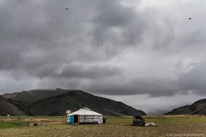 Типичная юрта. Налет цивилизации на жилище, которая появилось восемь веков до нашей эры. Вслушайтесь! ВОСЕМЬ веков! До нашей эры, Карл! И ничего особо не поменялось. В основе юрты деревянный каркас обшитый войлоком. Современность добавило к этой конструкции аккумулятор, который заряжается с помощью солнечной батареи, спутниковую тарелку и телевизор. Ну и рядом обязательно транспорт – мотоцикл, советский джип или ЗИЛ.