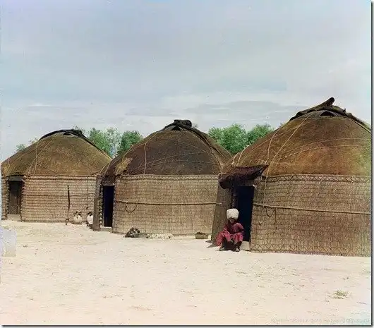 Три юрты и человек, сидящий в дверях юрт на переднем плане. Между 1905 и 1915 годами.