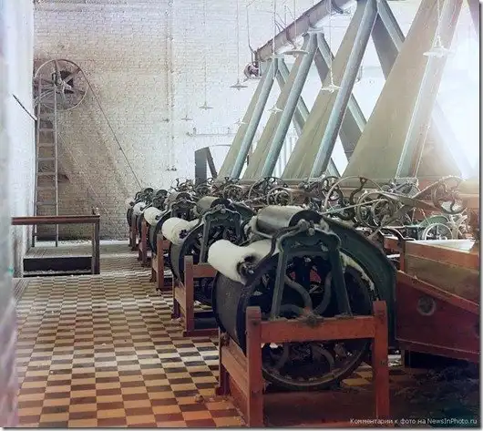 Интерьер хлопкопрядильной фабрики с машинами для производства хлопчатобумажной нити, возможно, в Ташкенте. Между 1905 и 1915 годами.