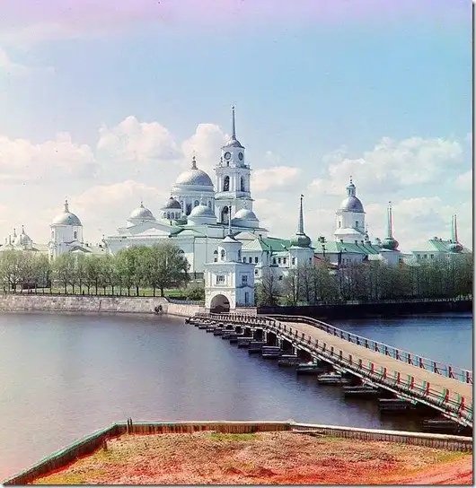Вид на монастырь с острова Светлица, Свято-Николаевский Столбенский монастырь, озеро Селигер. 1910 год.