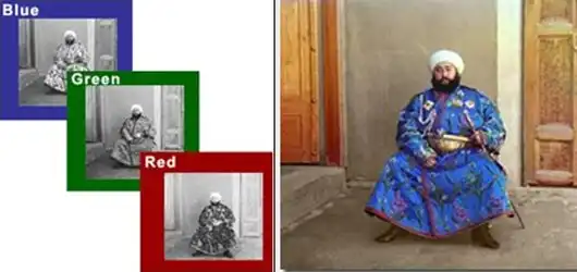 Создание цветных фотографий в начале 1900-ых годов было технически и материально сложно. Для того, чтобы создать цветные изображения, Сергей Прокудин-Горский отделил основные цвета с помощью фильтров и, таким образом, запечатлел три черно-белых изображения на стеклянной пластинке.