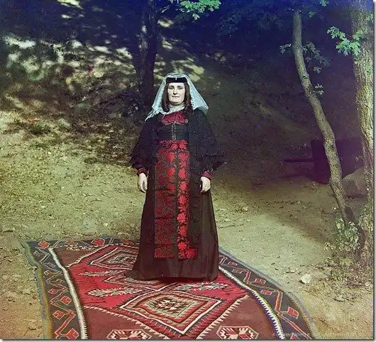 Грузинская женщина, стоящая на ковре, на улице, возле дерева. Между 1905 и 1915 годами.