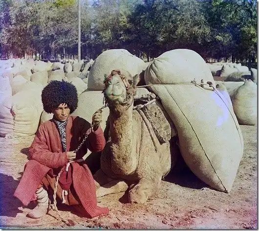 Человек и верблюд, нагруженный тюками. Между 1905 и 1915 годами