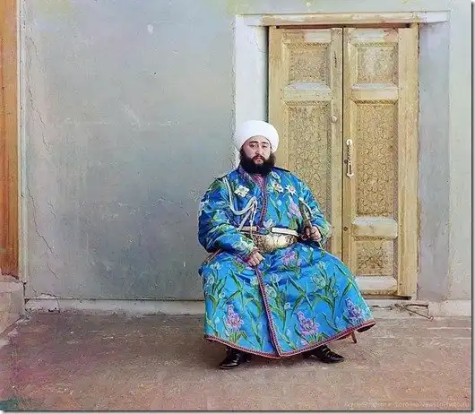 Алим Хан, эмир Бухары, сидя с саблей в ножнах. Между 1905 и 1915 годами.