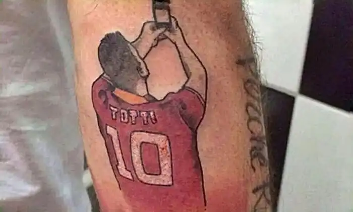 Когда Тотти забил гол в ворота «Лацио», он не смог удержаться и сделал селфи прямо на поле. Именно этот момент на своей руке набил один болельщик.