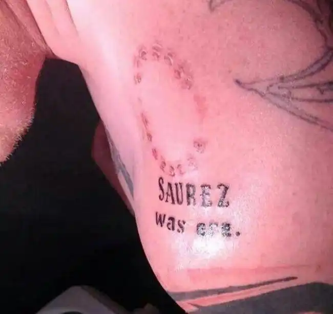 По замыслу это должны были быть якобы следы зубов Луиса Альберто Суареса, но мастер допустил ошибку в написании фамилии футболиста.