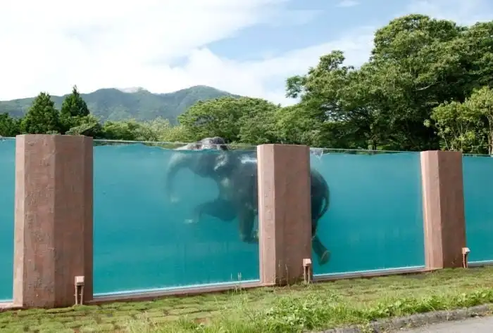Бассейн в сафари-парке Фуджи. Сотрудники парка построили бассейн, чтобы показать посетителям способность животных к плаванию.