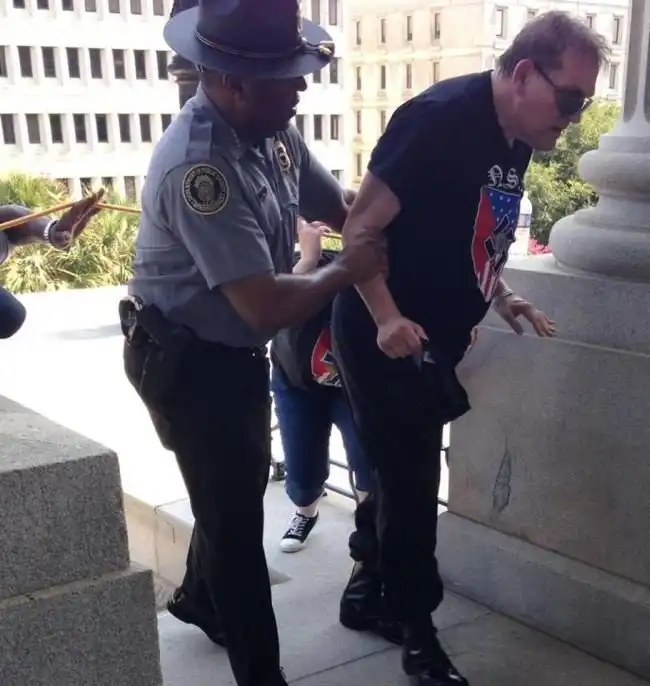 Чернокожий полицейский оказывает помощь активисту Ку-Клукс-Клана, получившего солнечный удар во время протестной акции.