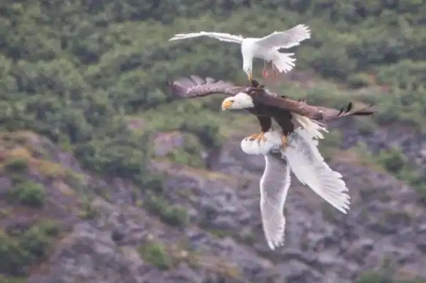 Одна чайка помогает другой освободится от лап орла.