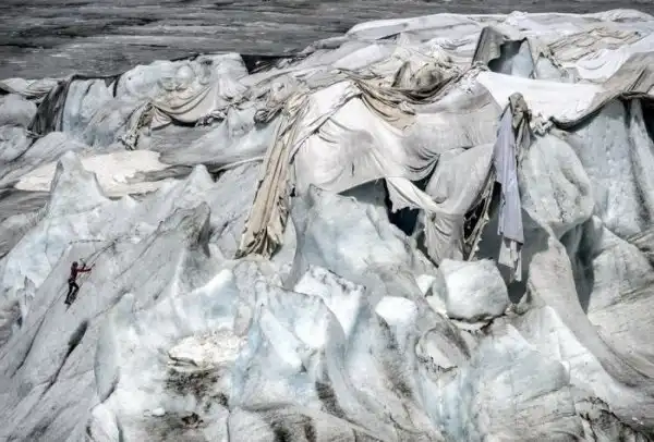 Женщина взбирается на Ронский ледник в Альпах. Чтобы замедлить таяние льда, в летнюю жару ученые накрывают часть ледника защитными одеялами.
