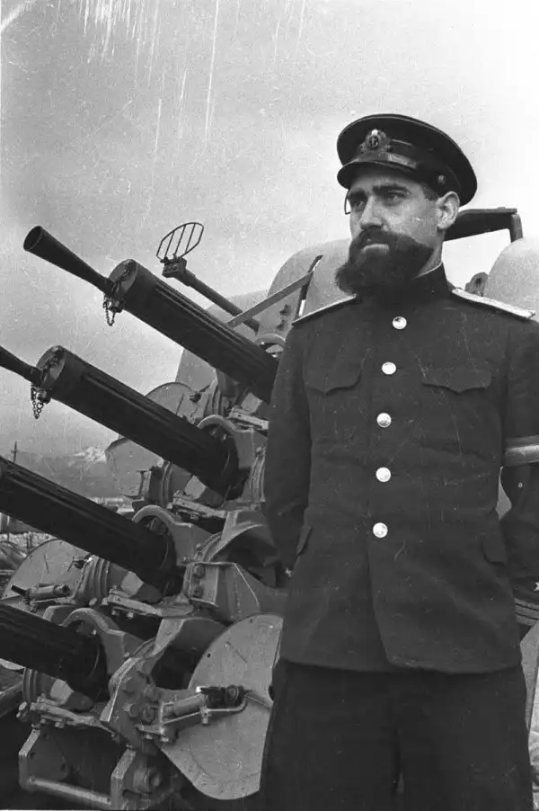 3. Советский вахтенный офицер в звании капитан-лейтенант на фоне 12,7-мм счетверённой корабельной зенитно-пулемётной установки «Виккерс».