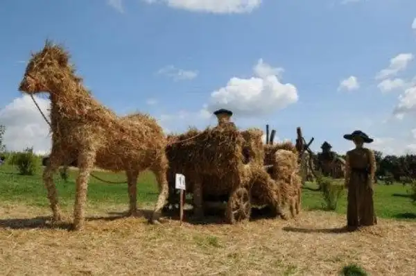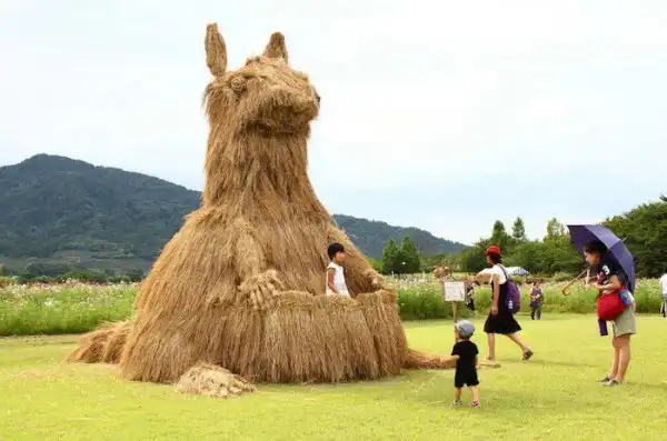 В Японии каждый год, после сбора урожая проводится фестиваль соломенных скульптур, который привлекает туристов и местных жителей своей необычностью. Фигуры создаются на полях, так как остается много сена. Для начала изготавливают каркас, который заполняют соломой, а затем склеивают. Этот материал хорошо гнется и режется. Скульптуры сохраняют декоративный вид долгое время, постепенно начиная темнеть.