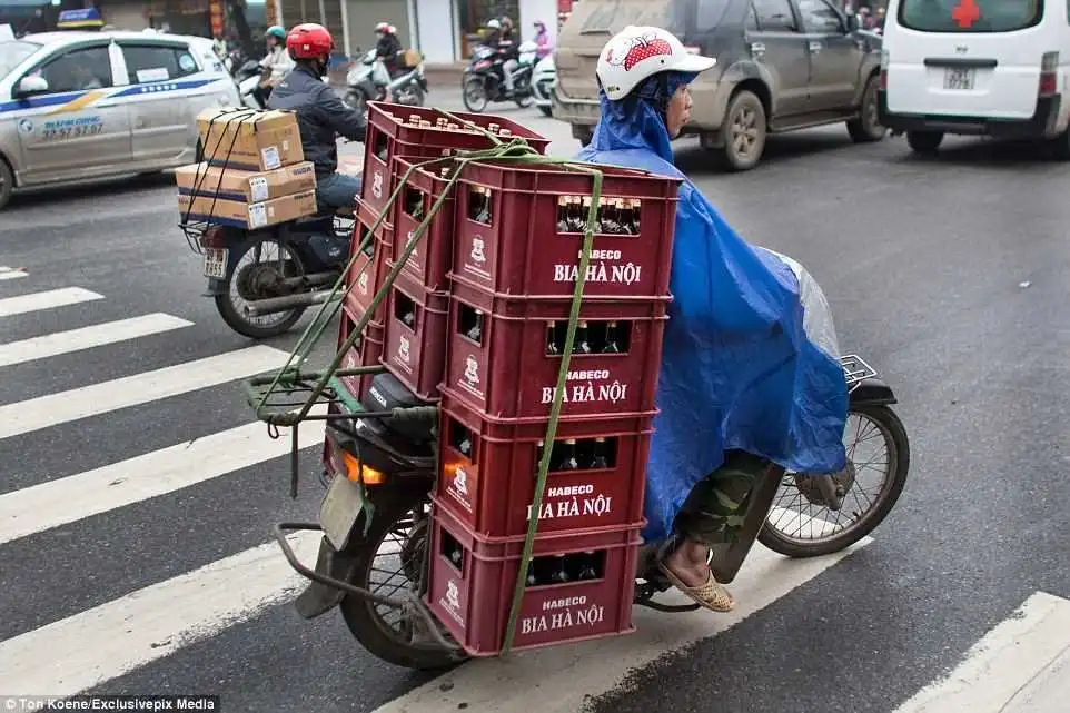 Они перевозят на своих мопедах, скутерах и мотоциклах всё: деревья, пакеты с аквариумными рыбками, бухты полиэтиленовых труб, цветы, бутылочное пиво и большие коробки.