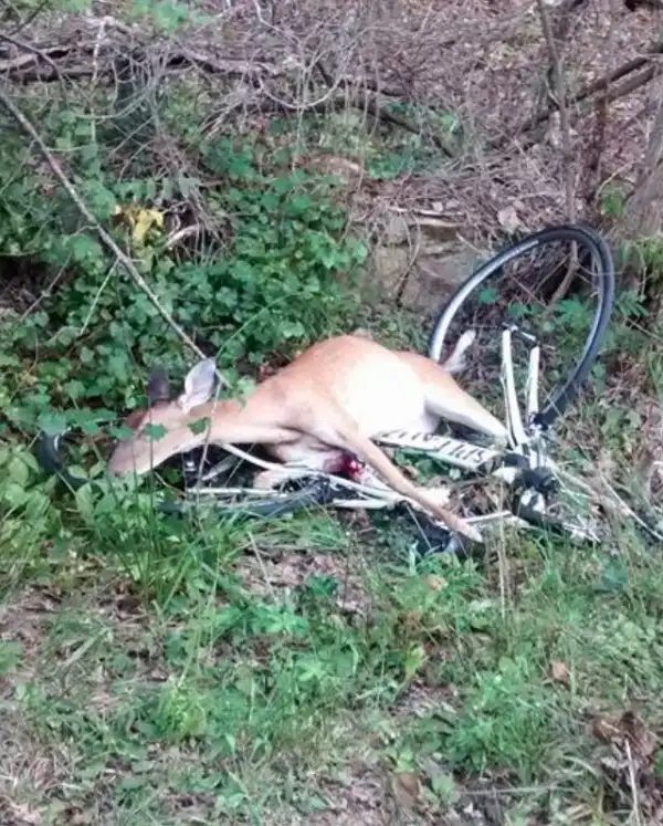 Охота с помощью велосипеда - не самая легкая, но достаточно эффективная. Велосипедист ехал со скоростью больше 30 км/ч, когда столкнулся с самкой оленя. Животное сломало себе три ноги, и прибывший на место происшествия шериф пристрелил его. Стальному коню тоже пришли кранты - восстанавливать нет смысла. А мужик через три дня после инцидента уже выглядел довольно сносно.