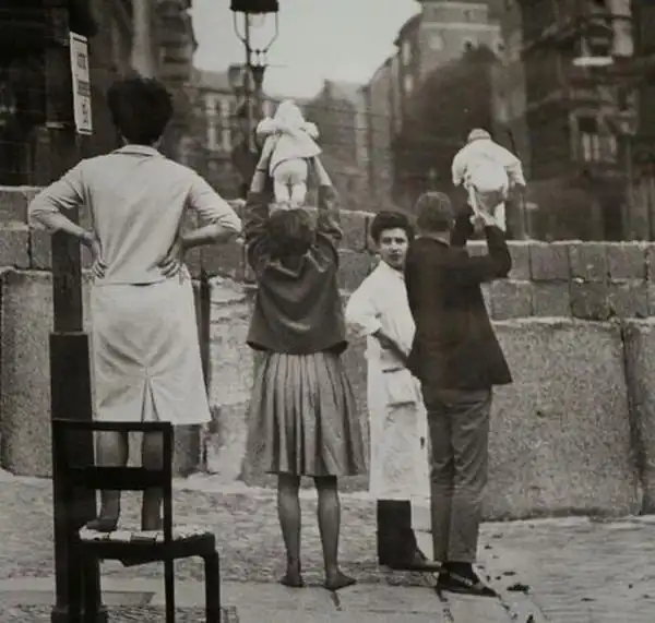 На фото молодые мама и папа показывают отпрысков своим родителям, а разделяет поколения возведенная в том же году Берлинская стена.