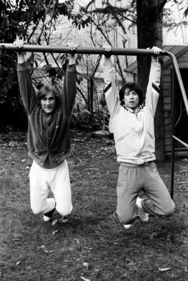 Жерар Депардье и Джон Траволта висят на низком турнике.