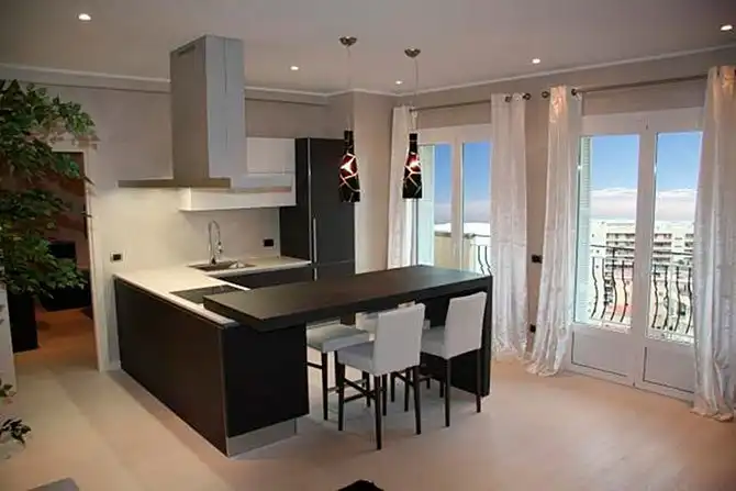Так выглядит уже вполне приличная, хотя все еще сравнительно недорогая (2,8 млн евро) «однешка» (точнее, квартира с одной спальней) площадью 80 кв. м. Квартира на пятом этаже, так что частично вид на море перекрывают стоящие ближе к воде дома. Дом в восточной части города, у самой границы с Францией.