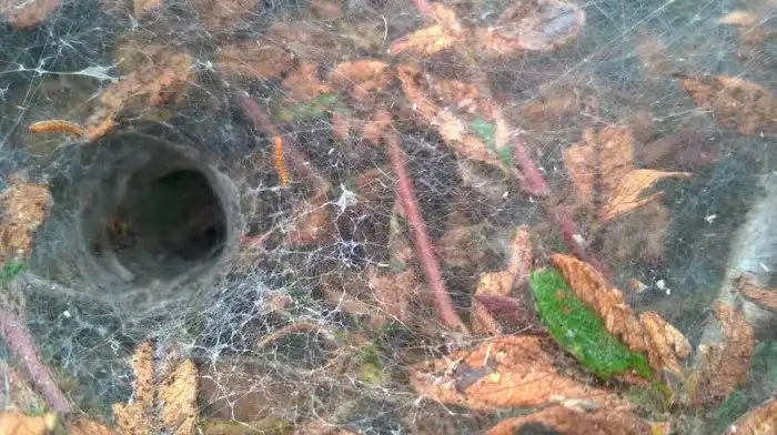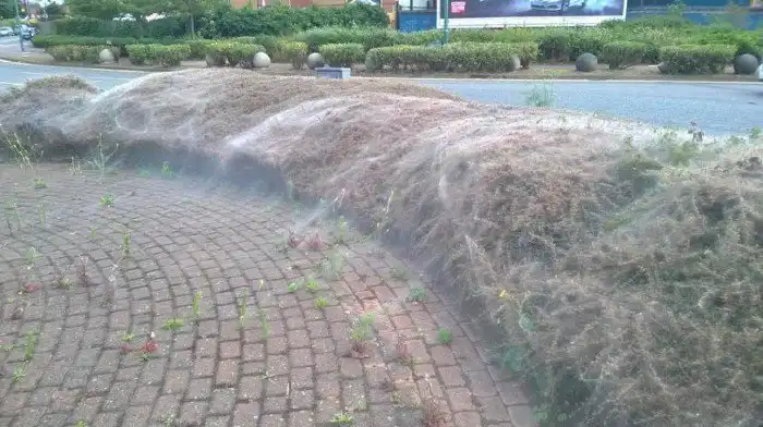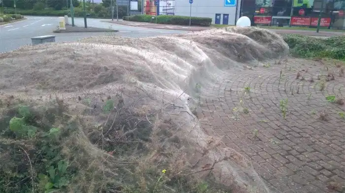 Житель Лондона Жако Зитсман (Jaco Zietsman) опубликовал на своей странице в соцсети загадочные фото, сделанные на улице Терапиа-лэйн. На фото кусты покрыты густой паутиной. В течение недели офисный работник Зитсман наблюдал, как гусеницы обволакивали паутиной кусты, превратив их в один большой кокон. Паутиной стали пользоваться и крупные пауки. Специалисты не могут определить причину подобного явления, хотя есть версия, что гусеницы делают это в целях защиты от хищников.