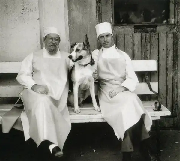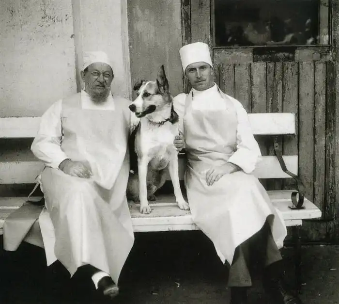 Евгений Евстигнеев, пес Карай и Борис Плотников во время съемок фильма «Собачье сердце». Ленинград, 1987