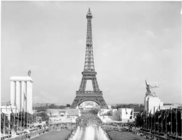 Советский и немецкий павильоны, стоящие напротив друг друга на ярмарке в Париже, 1937 г.